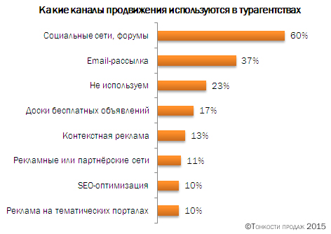 Но вернемся к результатам опроса. На втором месте по популярности — почтовая рассылка. Все логично: оба этих канала практически не требуют материальных затрат. Остальные инструменты использует незначительное количество турагентов: результаты по ним колеблются в пределах 10—20 %.
